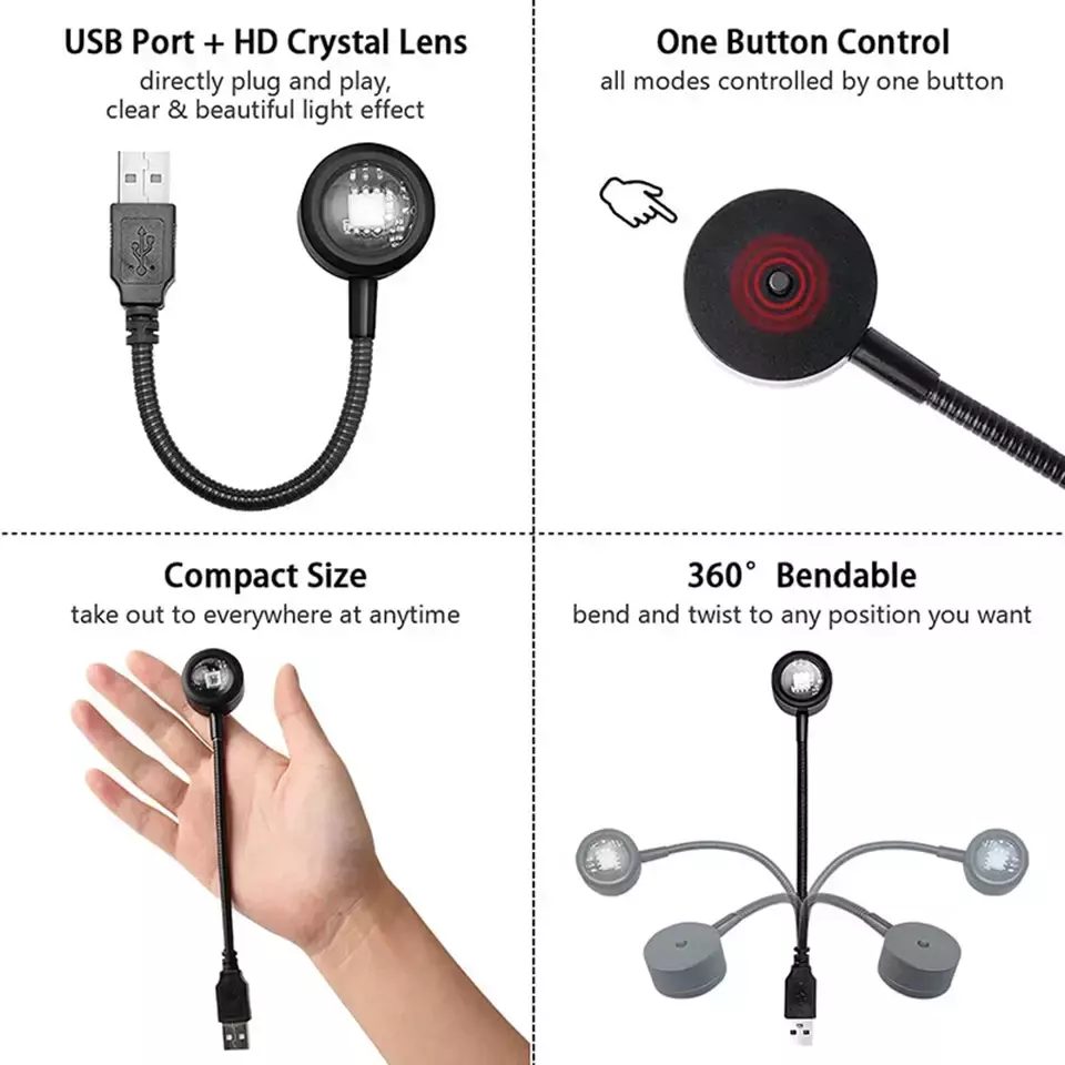 - Porta USB: plug & play.Lente de cristal HD: efeito de luz claro e bonito